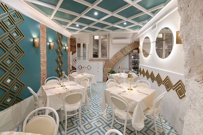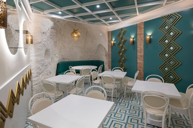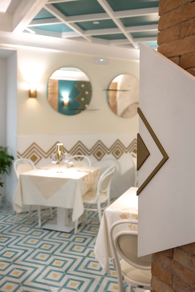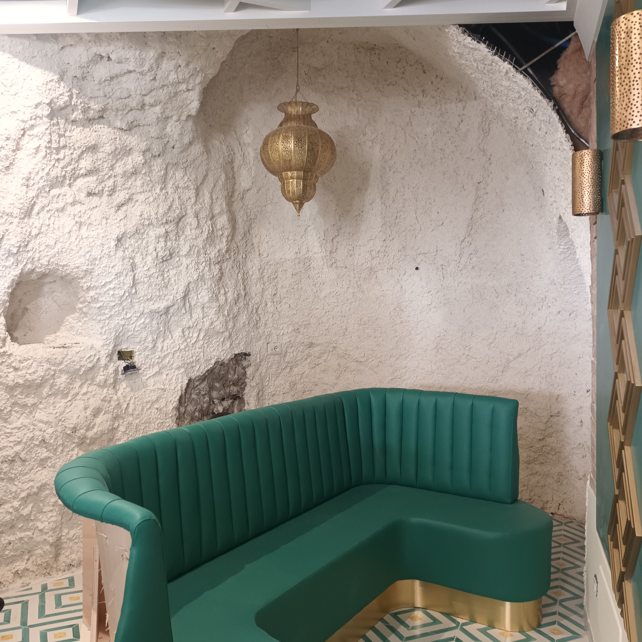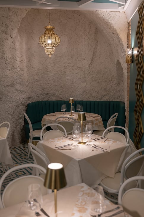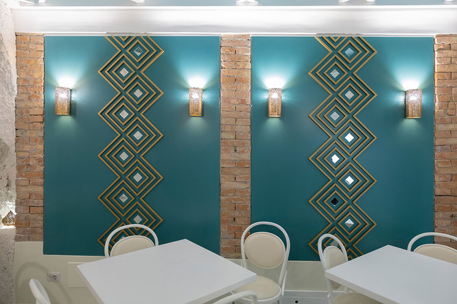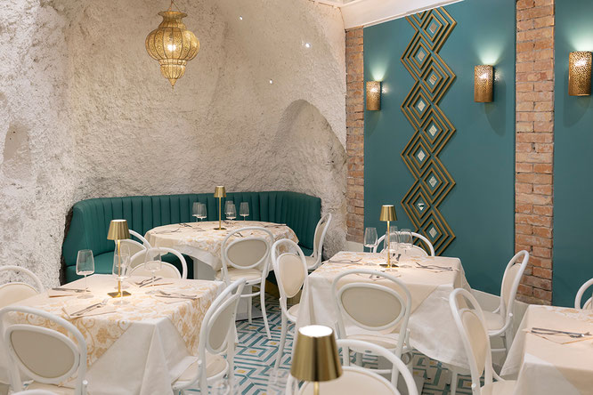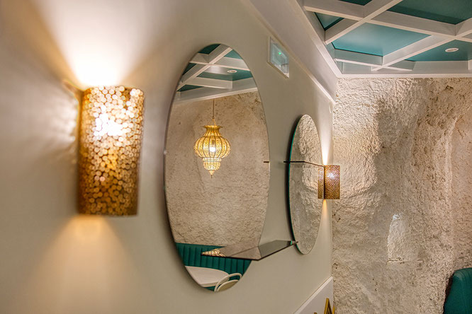 Uno stile che ricorda lo stile Marocchino , boiserie con cornici in legno che rivestono le pareti, specchi, lampade color oro e tavoli in legno bianco, sui quali si percepiscono le venature del legno .Un grande cassettonato che copre una parte della sale fino alla volta che definisce un angolo privè dove vi è una grande panca sagomata al muro.