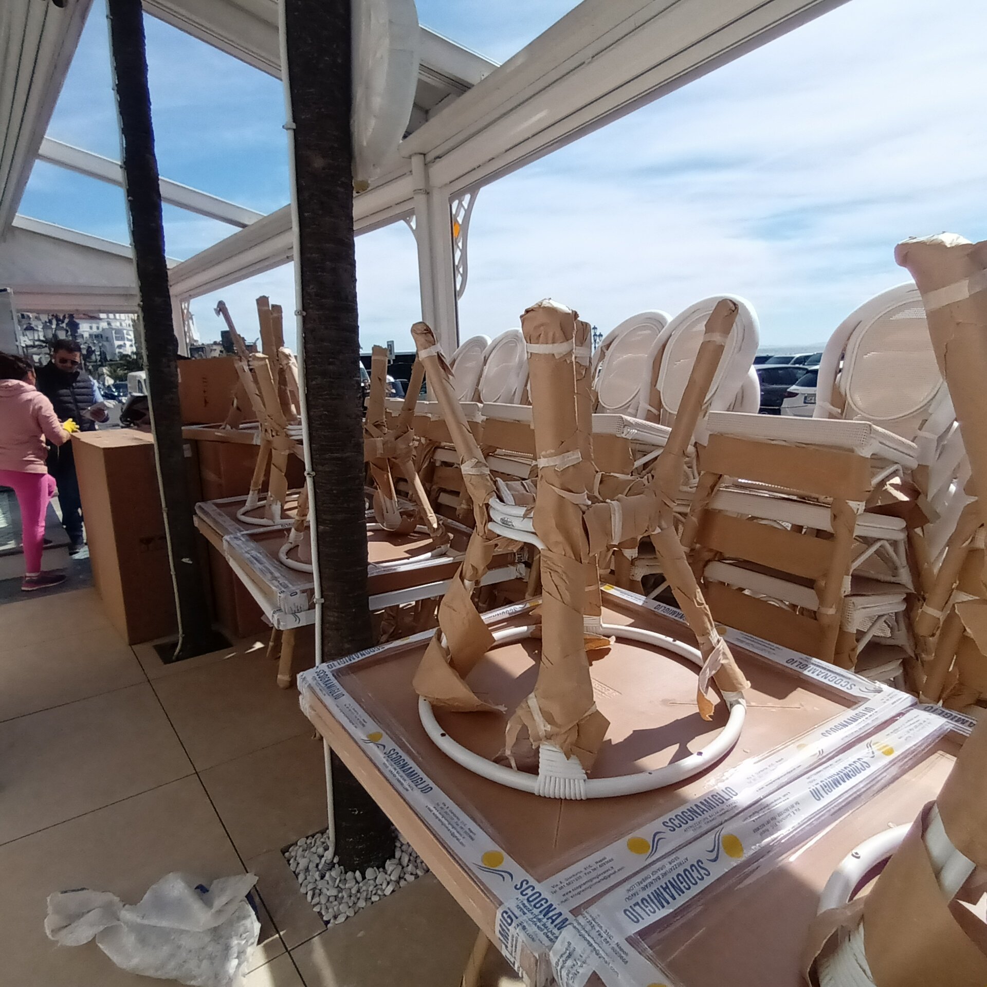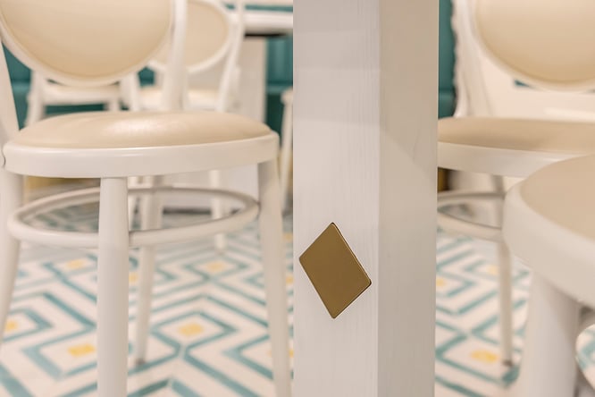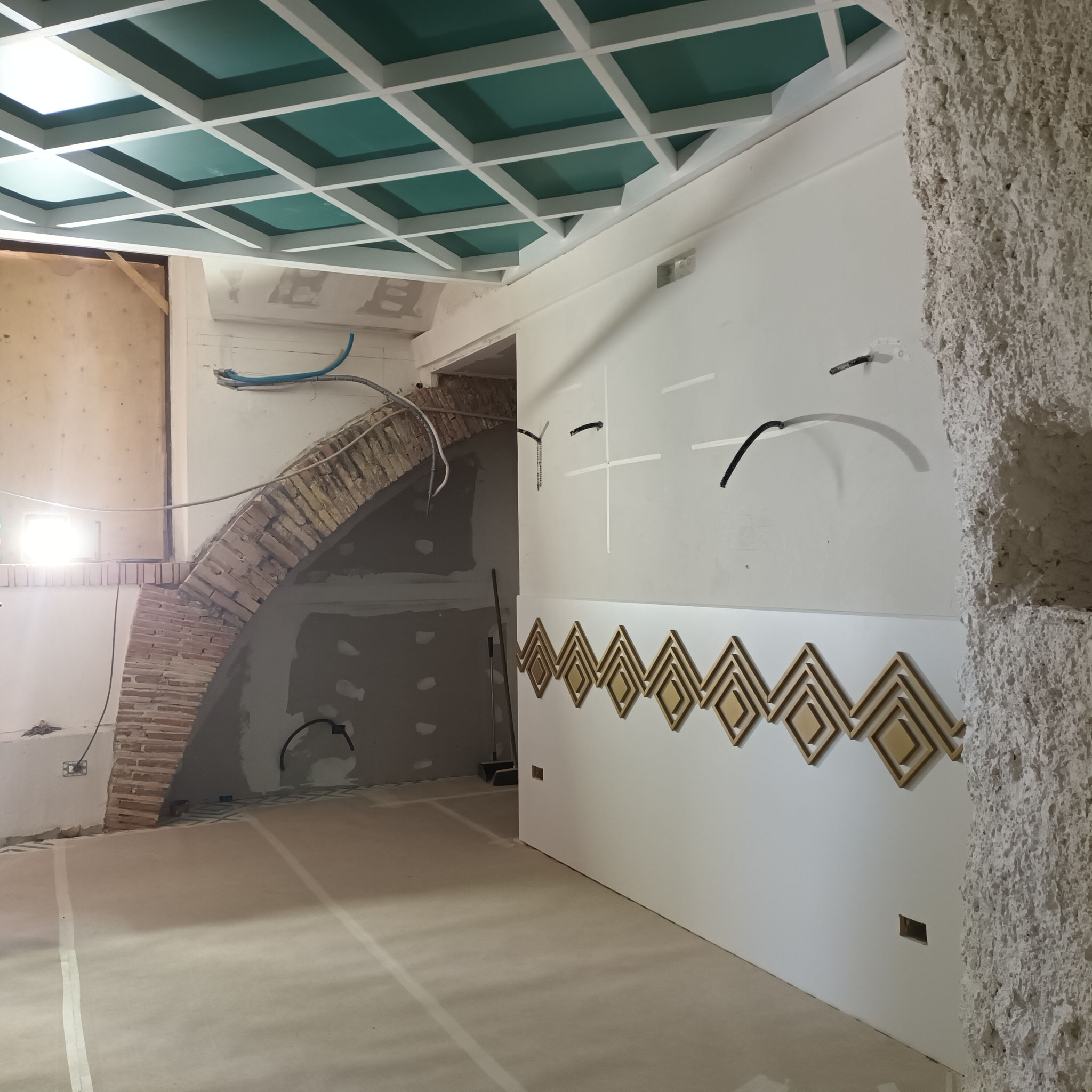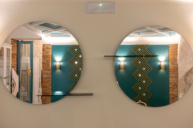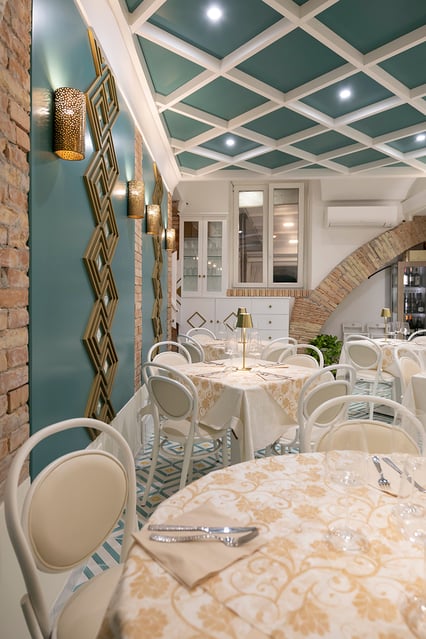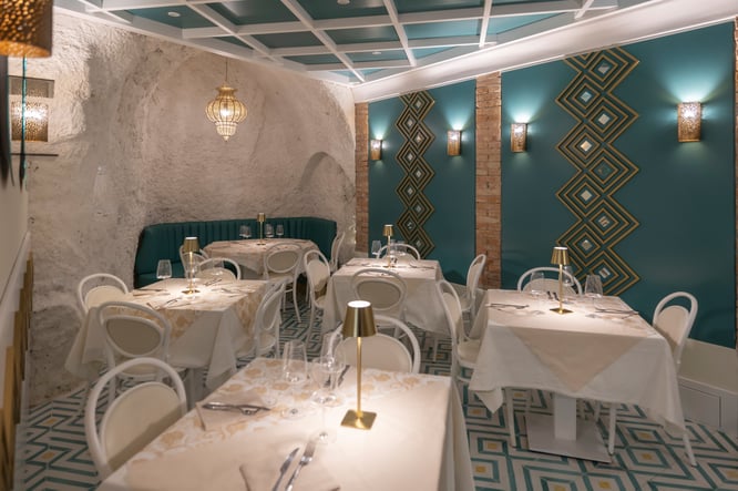 Uno stile che ricorda lo stile Marocchino , boiserie con cornici in legno che rivestono le pareti, specchi, lampade color oro e tavoli in legno bianco, sui quali si percepiscono le venature del legno .Un grande cassettonato che copre una parte della sale fino alla volta che definisce un angolo privè dove vi è una grande panca sagomata al muro.