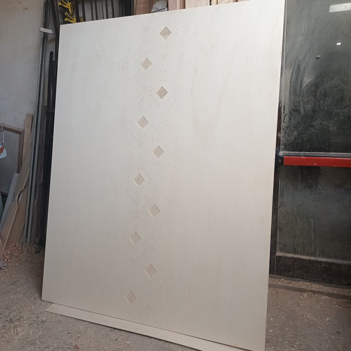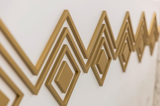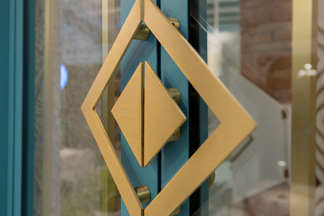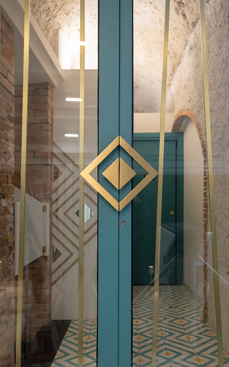 La grande porta di ingresso , che con il suo maniglione , con la sua trasparenza e la dinamicità dei tondini d'oro che diventano trama parla e si impone . Lascia intravedere ciò che aspetta il cliente. Movimento, luce e riflesso.