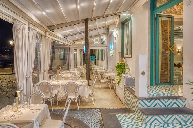 All'esterno il bianco predomina. Le tende fungono da filtri lasciando ampio spazio al meraviglioso panorama di Amalfi. Una pavimentazione galleggiante effetto Pietra d'Ostuni ricorda i materiali del Mediterraneo. La tradizione che incontra l'innovazione. Compattezza e unicità scandiscono lo spazio.
