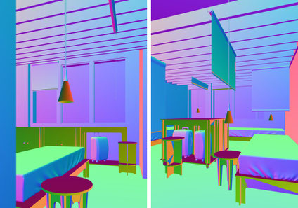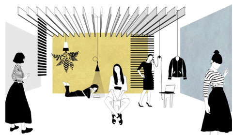 Le lampada e le prese, alimentate a soffitto e pendenti come dei rami, ammettano ampi spostamenti per l'organizzazione della camera. Allo stesso modo la tenda per la privacy, l'appendiabito e, rimando al carattere domestico dell'abitare, l'elemento vegetale, fanno parte di un sistema funicolare verticale.