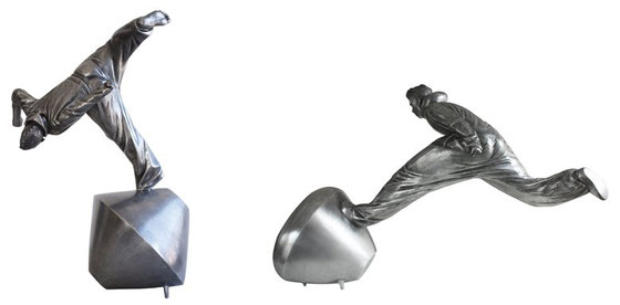l gruppo "intersezione" nasce nel 2012 dall'esigenza di indagare e sperimentare le corrispondenze fra architettura e scultura. Dal punto di vista pratico il gruppo si propone di progettare e produrre prototipi in scala per un'indagine concreta sul piano percettivo. Nelle due opere che vengono presentate il tema è enunciato nella scultura e sviluppato nella costruzione dello spazio architettonico. Il gesto rappresentato nelle due sculture è un " lungo e rallentato salto" col quale prima si giunge ad un approdo e poi lo si abbandona. Entrambe queste azioni (Gap1 e Gap 2) fanno registrare un picco nel grado di entropia della sfera emotiva. Il gesto di arrivare scaricando tutte le proprie energie sul piede che tocca per primo l'approdo,oppure,al contrario,caricare un solo piede d'appoggio per darsi allo slancio inverso ad abbandonare il punto di partenza,sono due momenti che disegnano una porta. Qui si innesta infatti il pensiero architettonico. Se attraversiamo uno spazio ne siamo attraversati. La porta regola e delinea questa proprietà transitiva. Lo spazio prende corpo come proiezione che si stira lungo la direzione di moto della figura che lo percorre. Gli specchi laterali (Gap1) moltiplicano la vibrazione di questo moto. Lo stare in "bilico" della figura (Gap2) è invece suggerito dallo specchio orizzontale sul quale la figura si sporge. scultura e architettura corrono al salto,l'una come contenuto,l'altra come contenitore.