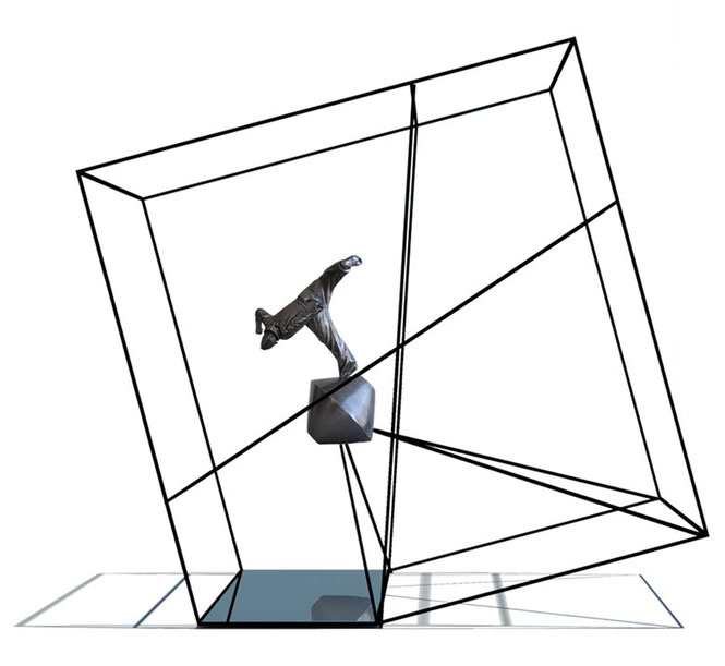 SCULTURA IN ALLUMINIO A CERA PERSA + STRUTTURA IN ACCIAIO _ SCULTURA :106 L X 70 H X 38 P CM _ STRUTTURA: 226 L X 226 H X 180 P CM