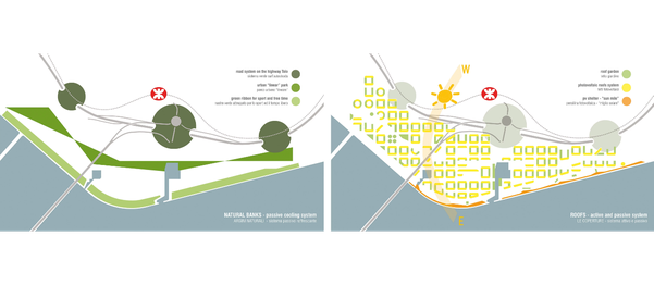 the highway, enclosed the settlement in “natural” banks: the “urban density” is interrupted in a right way by large green areas planned as a passive cooling system.