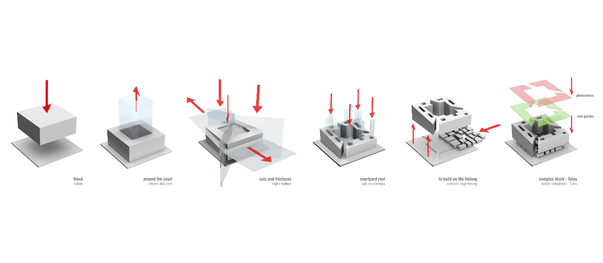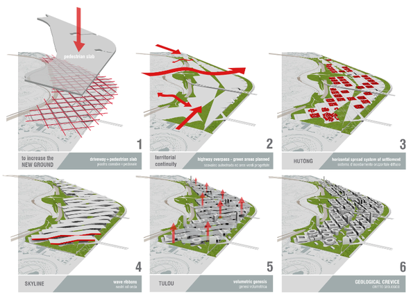 takes shape just like that: driveway level > pedestrian level with a linear park and the grid of the Hutong > grid of the blocks > waving skyline of the green/photovoltaic