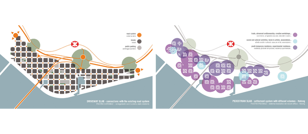 una preesistenza "archeologica" su cui ricostruire l’insediamento. Attraverso un sistema diffuso di collegamenti verticali e di "vuoti" strategici la città carrabile e la città sostenibile