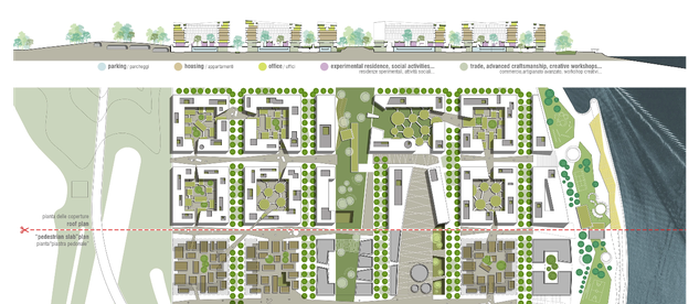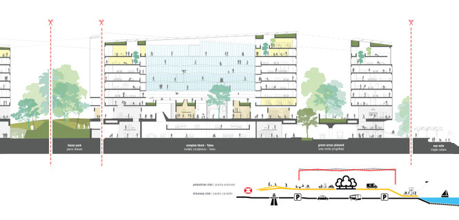 esistente, a quota +10 metri, invece, la vita della città sostenibile prende forma; il piano pedonale si distende per l'intero sviluppo del lotto in una successione_mare> nastro verde>