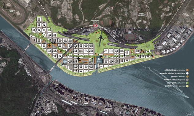 on the Highway Tolo > University > landscape. A grid E/W divides the area in blocks of 70 x 70 metres whose regularity is intentionally interrupted by the urban park. The volumes, following