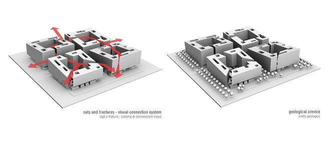 una doppia esposizione. Tagli e fratture degli isolati, inoltre, definiscono un ulteriore sistema di connessione visiva volto ad intensificare l'uso degli spazi collettivi.