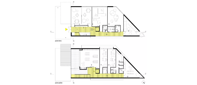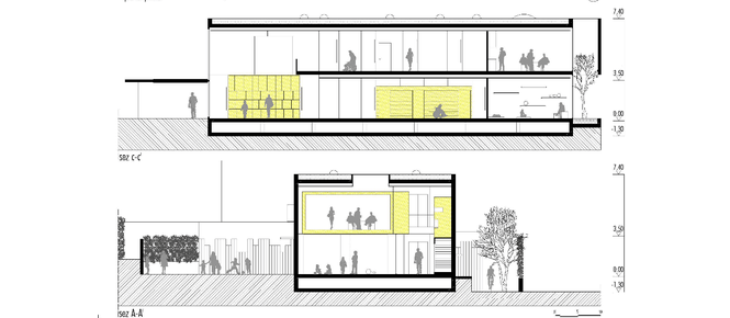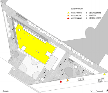 La ludoteca accoglie i suoi utenti tramite uno spazio a doppia altezza, da dove si accede alle aule del p.t. e alle sale del 1°p. .Lo spazio assolve le funzioni di accoglienza e spogliatoio,ed è animato da un grande cannocchiale che dalla sala multifunzione si affaccia sull’aula giochi e sul parco degli alberi,inoltre un “tubo” colorato avvolge le scale di accesso al 1°p. Sempre al p.t. si prevede per le due aule gioco l’unione per lo svolgimento delle attività comuni e l’ apertura sull’area esterna,le attività di relax, motorie e di riposo invece, vengono servite da un connettivo dove insistono anche i servizi per i bambini e gli operatori .Al1°p. troviamo tutte le funzioni di servizio per gli operatori e genitori. L’architettura degli spazi interni permette relazioni tra le varie funzioni e contemporaneamente instaura un sistema di rapporti anche con l’esterno tramite il cannocchiale verso il parco, le aperture sull’area giochi ,sul giardino della ludoteca e sulla vasca d’acqua del viale alberato. Tutti gli spazi interni e connettivi della ludoteca sono dotati di luce naturale;i lucernari del 1°p. ,e le grandi finestre del p.t., rendono gli spazi accoglienti e confortevoli.