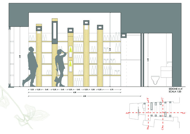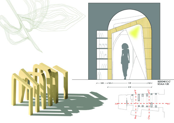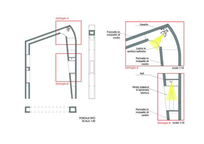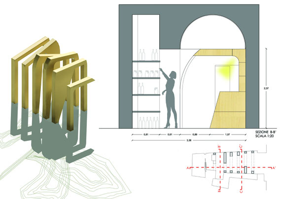 L'elemento è costituito da pannelli in legno di cedro,da lastre di acrilico satinato che coprono i corpi illuminanti e da mensole e nicchie integrate che fungono da punti di esposizione.