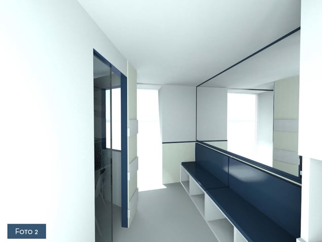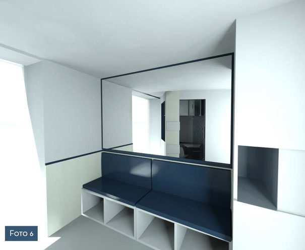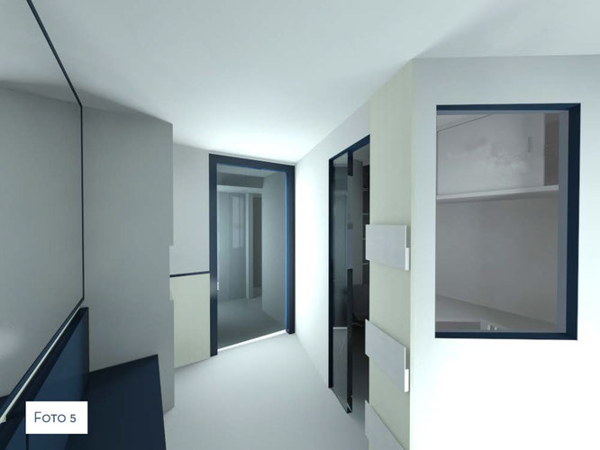 La parete in cartongesso, di forma irregolare crea con il suo movimento una sorta d' invito ad entrare.